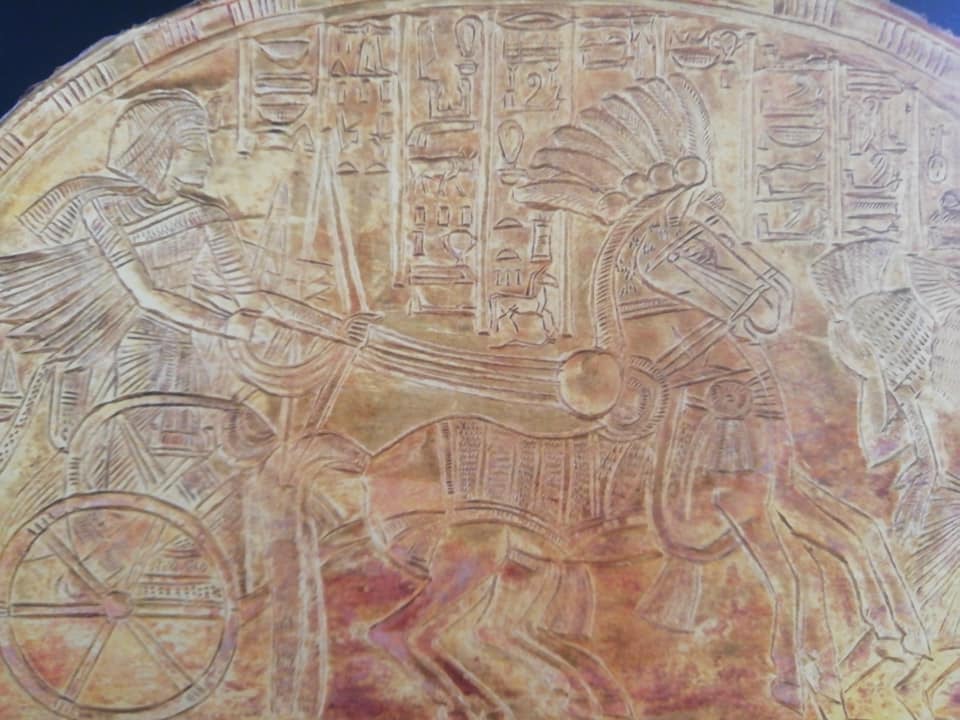 Il ventaglio in legno dorato con la scena di caccia allo struzzo ha una decorazione a rilievo con dettagli incisi che narra di un viaggio intrapreso da Tutankhamon nel deserto orientale, a caccia di giovani struzzi.