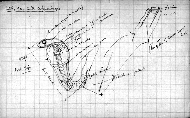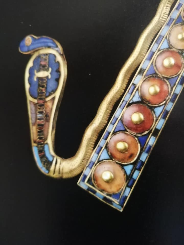 Il “cappuccio” del cobra, in oro intarsiato con cornalina e pasta vitrea blu scuro, era fissato ai segmenti del corpo tramite fili in oro fatti passare attraverso piccoli occhielli. La testa del serpente è in pasta vitrea blu, con occhi in ossidiana.