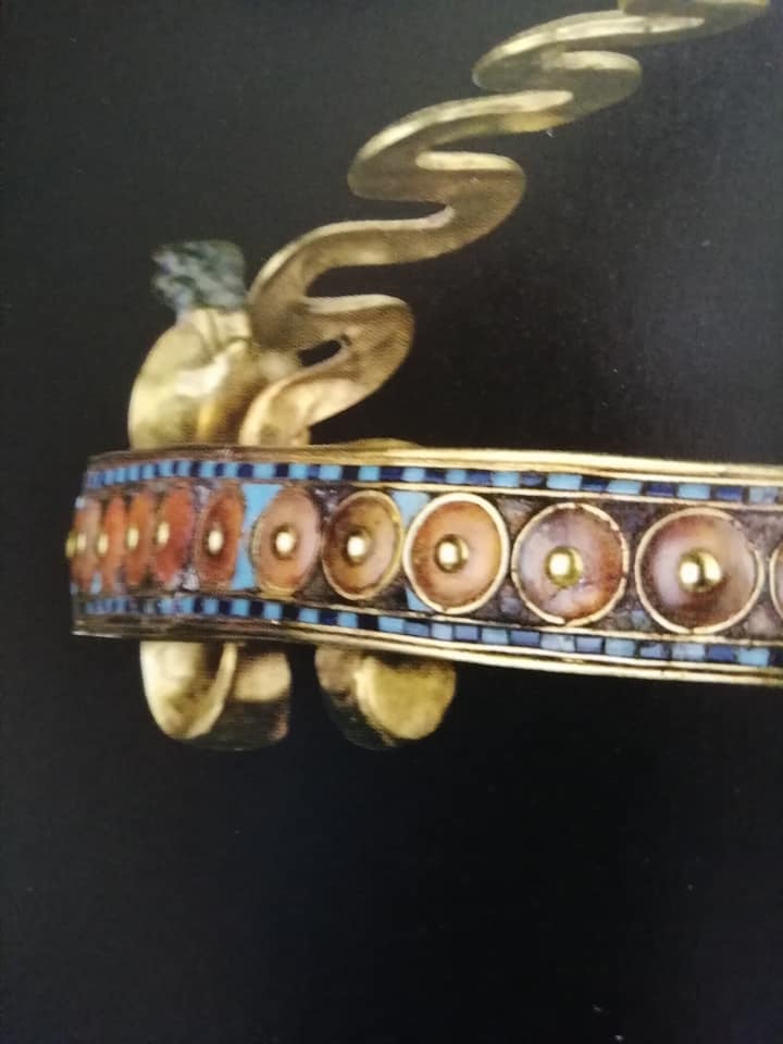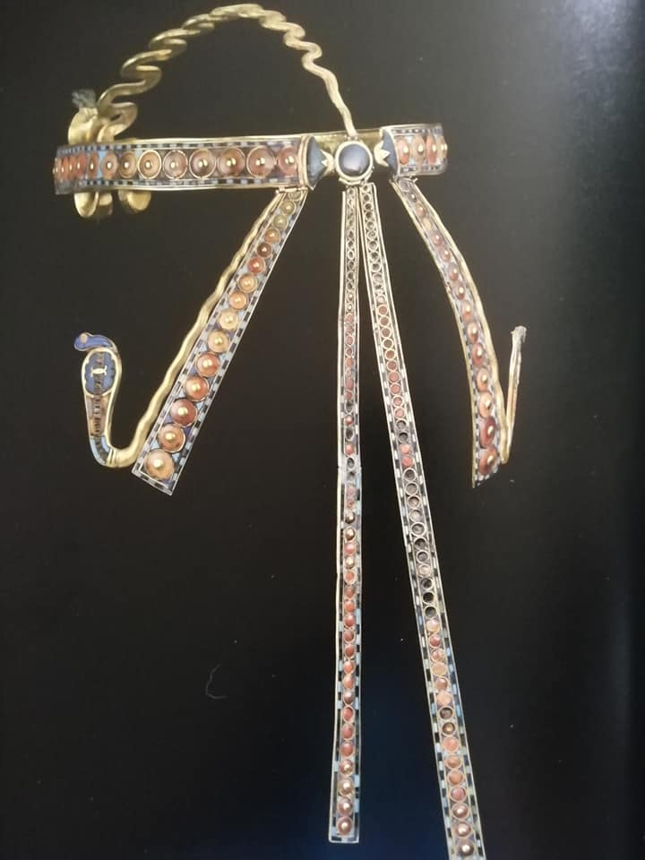 Di sicuro e stato fatto appositamente per il sovrano: è costituito da una fascia frontale in oro puro e intarsiato di pasta vitrea turchese e lapislazzuli e decorata con cerchi in pasta vitrea color cornalina, ciascuno dei quali ha un punto d’oro al centro.