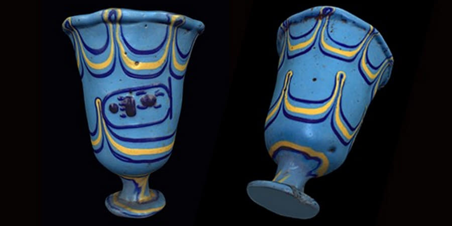 Rara coppa di vetro policromo traslucido è stata creata in Egitto verso la fine della 18 dinastia, alta 9,3 cm per 124 grammi di peso. Il corpo a forma di campana è stato probabilmente realizzato trascinando vetro acquamarina traslucido su un nucleo montato su un’asta. Quindi, quindici tracce di canna rossa e gialla sono state applicate in bande orizzontali parallele. Mentre erano ancora morbide, queste bande venivano trascinate alternativamente su e giù con uno strumento contundente. Un solido rivestimento giallo opaco sul bordo, più un piede ad anello e due piccoli manici di canna blu e gialla completano la decorazione di questo pezzo squisitamente eseguito. Raro per la sua forma, la sua decorazione e il suo tema insolito.