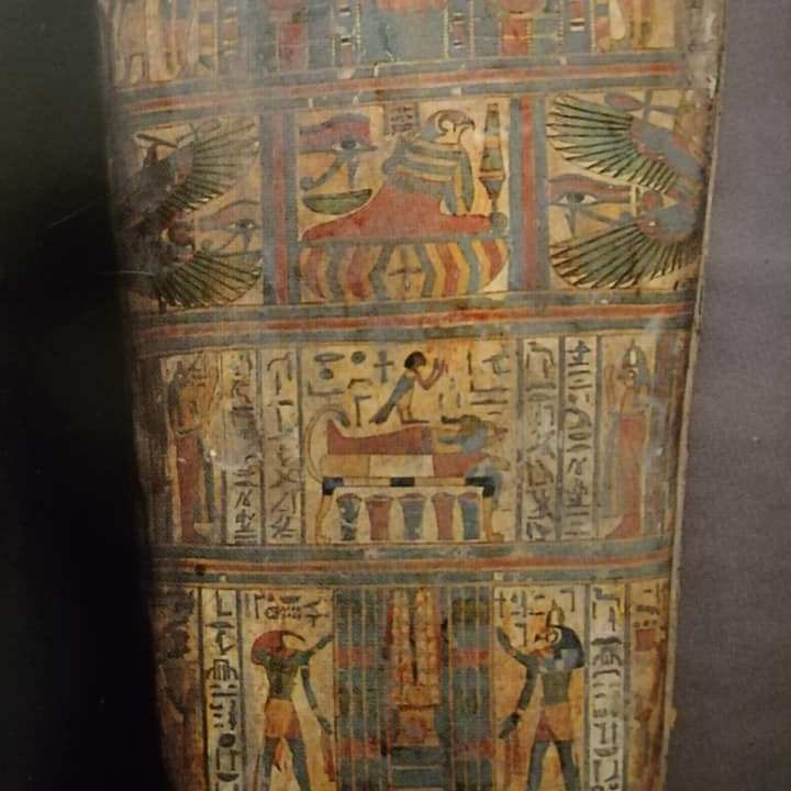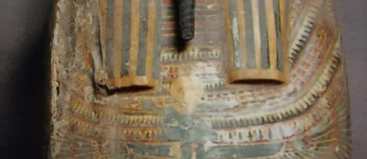 Il sarcofago, di forma antropoide, presenta l’immagine del defunto con parrucca tripartita, striata a fasce nere e gialle, sormontata da uno scarabeo con disco solare, sul volto è attaccata la barba posticcia rituale.