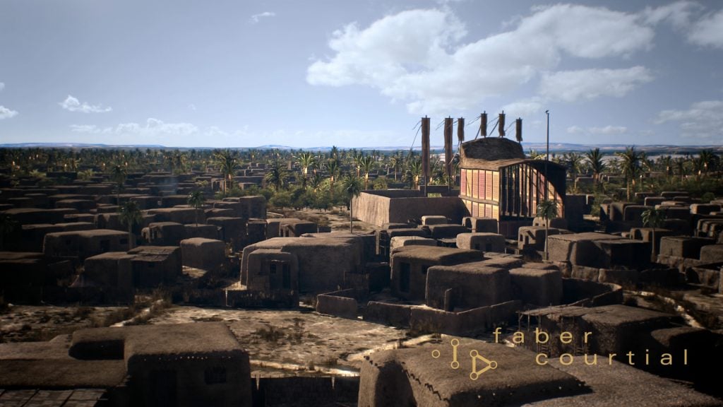 Nell’immagine in basso, un’ipotetica (e suggestiva) ricostruzione dell’area cerimoniale di Hierakonpolis prodotta da Faber-Courtial uno dei più noti studi tedeschi per l’elaborazione di modelli 3D e realtà virtuali.