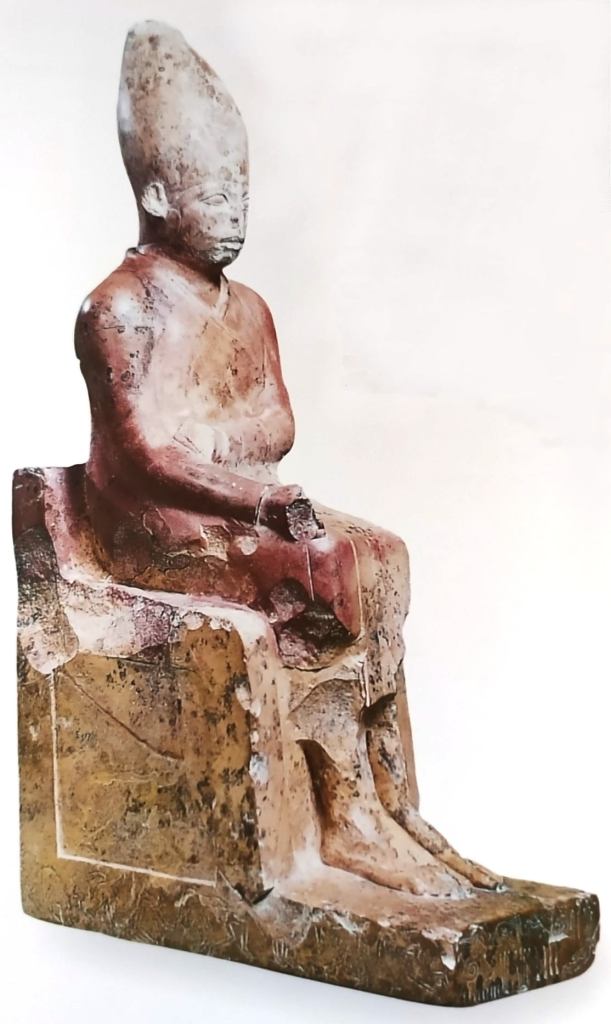 Da Hierakonpolis, II Dinastia. Il sovrano sembra abbigliato con un manto, probabilmente quello del giubileo. Indossa la corona bianca dell’Alto Egitto ed e assiso su un semplice trono che reca incisa la figura di un uomo legato, simbolo del Basso Egitto conquistato e figure di uomini che si contorcono negli ultimi aneliti di vita. Le iscrizioni ci informano che furono uccisi 47.209 nemici. Calcare, altezza cm. 62. Oxford, Ashmolean Museum.
