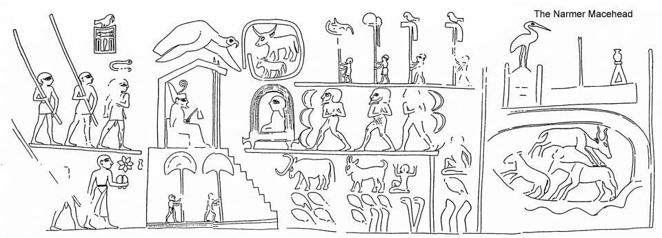 La ricostruzione di questo complesso cerimoniale ricorda fortemente la scena raffigurata sulla testa di mazza di “Narmer”, che mostra anche l’insolita rappresentazione di un muro in mattoni crudi di forma sinusoidale.