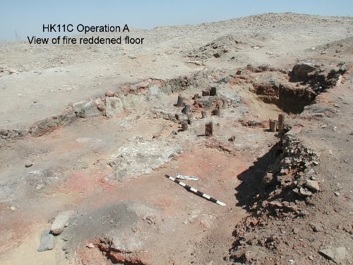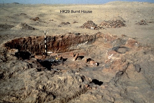 A partire dal 1967 cominciò una serie di ricerche interdisciplinari ad opera di uno studioso americano, Walter Ashlin Fairservis, (Brooklyn, NewYork, USA 1921 – Sharon, Connecticut, USA 1994), che puntò l’attenzione sull’area dell’antico centro abitato. Le esplorazioni, avvenute a più riprese tra il 1967 e il 1987, hanno permesso di ricostruire una pianta delle strutture protodinastiche seguendo lo sviluppo di una serie di edifici che si diparte da un ampio ingresso in mattoni crudi, decorato con aggetti e rientranze, identificato dall’archeologo nel 1969. Nel 1978 le indagini sono proseguite con un’equipe specializzata negli studi sul predinastico, diretta da Michael Allen Hoffman (Washington, USA 1944-1990). Lavorando al grande insediamento ai margini del deserto (denominato Hk29), nel 1978 Hoffman si imbatté nei resti carbonizzati di una dimora sotterranea di forma rettangolare (4 x 3,5 metri) che era palesemente parte di un complesso di strutture di epoche diverse. Le basse pareti in mattoni crudi, che probabilmente dovevano essere ricoperte da una cannicciata dipinta, affondano in trincee che hanno restituito tracce di un focolare e buchi per pali che dovevano sostenere, evidentemente, un portico. Nelle vicinanze è presente un forno costituito da otto cavità dotate di alari in ceramica che fungono da base di appoggio per grossi vasi. E’ del tutto plausibile che da lì si siano alimentate le fiamme che distrussero l’edificio. L’analisi al C14, ha rivelato che la struttura risale 3435± 121 a.C. vale a dire al periodo di transizione dall’amratiano al gerzeano (Naqada I-II) durante il quale l’espansione demografica portò ad un notevole incremento delle attività umane (Hoffman, 1980). Queste scoperte sono state poi ulteriormente incrementate durante l’esplorazione avvenuta nel 1988 ad opera di Jeremy Geller, che mise in luce un ampio sito destinato alla produzione di birra (Hk24A), localizzato a nord-est del complesso fortificato e destinato all’approvvigionamento sia dei vivi che dei defunti. (Geller 1989,1992). I residui nei contenitori hanno permesso di ricostruire la ricetta di questa bevanda nutriente e poco alcolica: una base di frumento alla quale venivano aggiunti datteri e uva per apportare gli zuccheri necessari alla fermentazione. Nei pressi di questo impianto, in un altro forno per la ceramica, si producevano vasi standardizzati per lo stoccaggio del prodotto. Si è stimato che gli otto tini scoperti avrebbero potuto produrre circa 1200 litri di bevanda al giorno; una quantità decisamente sovrabbondante per le necessità di una famiglia. Di fatti un quantitativo del genere poteva agevolmente costituire la razione giornaliera per oltre 200 persone.