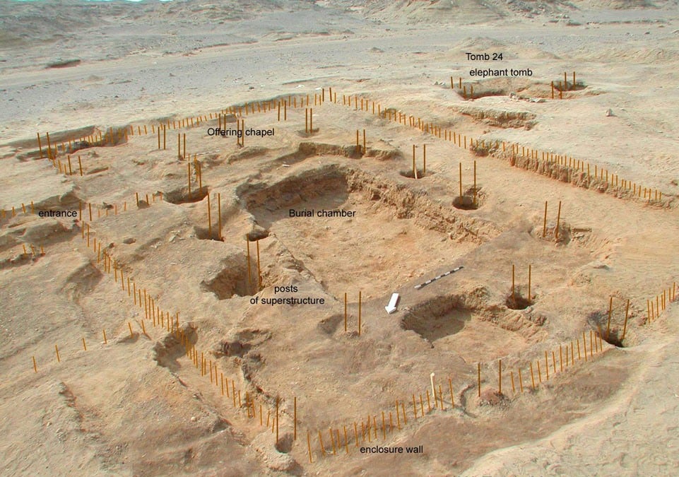 Il recinto con la sala a pilastri, situato al centro del cimitero, era senza dubbio utilizzato per i culti mortuari di coloro che qui venivano sepolti e ci fornisce la visione di un elaborato scenario funerario che non ci si sarebbe aspettati per un’epoca così remota. Ma la loro scoperta ha posto un problema in quanto la configurazione dei pilastri attorno alla tomba 23 lasciava presupporre che si trattasse di elementi riutilizzati. Inoltre, appariva evidente che diversi pali della sala con pilastri (E8) erano stati rimossi per seppellire l’elefante africano trovato nella Tomba 24 (presumibilmente appartenente allo stesso entourage della Tomba 23): l’ipotesi di “riciclo”, a questo punto, è diventato ancora più plausibile.