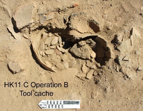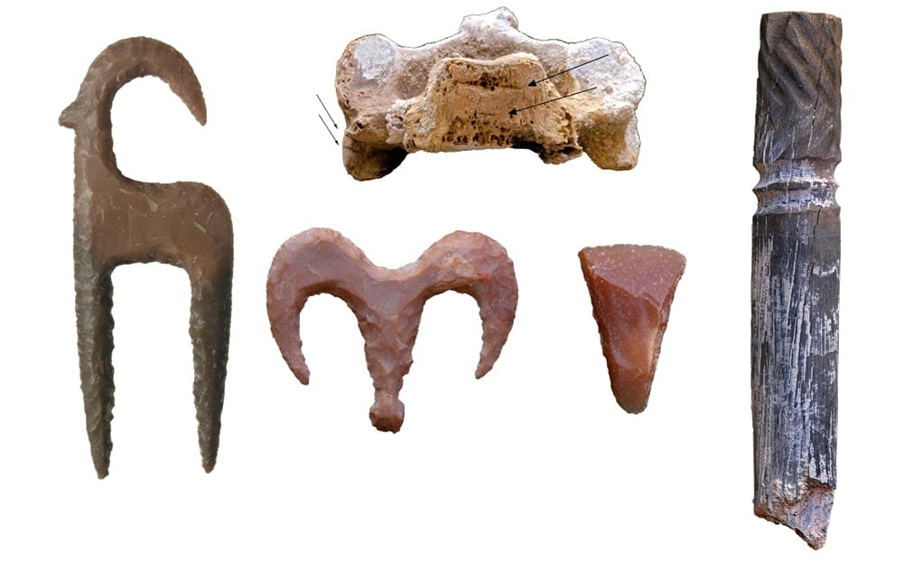 Dagli angoli è stato raccolto anche un gran numero di eleganti punte di freccia a base cava, alcune delle quali, di grandi dimensioni, anticipavano il gigantismo delle teste di mazza votiva e delle tavolozze rinvenute nel Deposito Principale. L’abilità esecutiva lascia pochi dubbi sul fatto che gli stessi artigiani abbiano anche realizzato uno stambecco di selce scoperto nella Struttura. Altri animali di selce sono stati trovati negli angoli di altre strutture, sempre in associazione con punte di freccia o altri attrezzi da caccia, e suggeriscono attività rituali simboliche di controllo. Elementi di una classe relativamente rara di artefatti, queste figurine in pietra provenienti dalla necropoli HK6, rappresentano, al momento, la più grande collezione di animali in selce di provenienza nota.