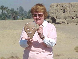 Barbara Adams (Hammersmith, Londra, 19 febbraio 1945, Enfield, Londra, 26 giugno 2002) con una delle straordinarie maschere funerarie in ceramica rinvenute nella località Hk6. Si tratta delle prime maschere funerarie note dell’Antico Egitto. Dal 1997 al 2000 Barbara Adams ha ripreso gli scavi nella necropoli e sorprendentemente ha riportato alla luce ricche sepolture risalenti anche al periodo Naqada IIab, 3700 a.C. circa. Il suo lavoro ha riportato alla luce diverse tombe d’élite, tra cui una di un giovane elefante ed un’altra contenente un grande bovide selvatico (uro), sepolto alla maniera umana con stuoie a ricoprire il corpo, ceramiche e finanche una figurina antropomorfa.