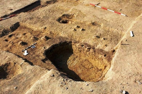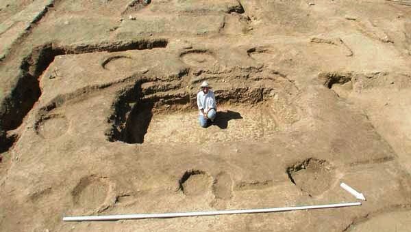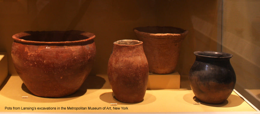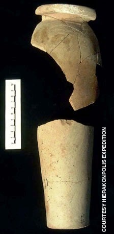 A sinistra: immagine n. 4 L’area del tempio in cui fu rinvenuta la Tavolozza di Narmer. A destra: immagine n. 5 Vaso risalente all’epoca di Narmer rinvenuto in una fossa del cortile del Tempio che fu solo parzialmente esplorata nel 1989. (Courtesy of the Hierakonpolis Expedition © Archaeology’s InteractiveDig)