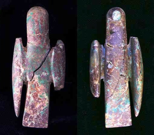Un’altra sepoltura degna di nota è la Tomba 412, appartenente ad un maschio di mezza età. Nonostante sia stata saccheggiata, i ladri hanno lasciato qualcosa. Avvolto in una pelle di animale e nascosto sotto i capelli ancora presenti sulla testa del defunto, è stato ritrovato un coltello di selce a coda di pesce ancora infisso nel suo manico di canna. Aveva ancora il suo fodero di cuoio sopra la lama a dimostrazione che questi oggetti non solo erano considerate armi pregiate, ma ritenute molto pericolose anche dopo la morte.