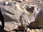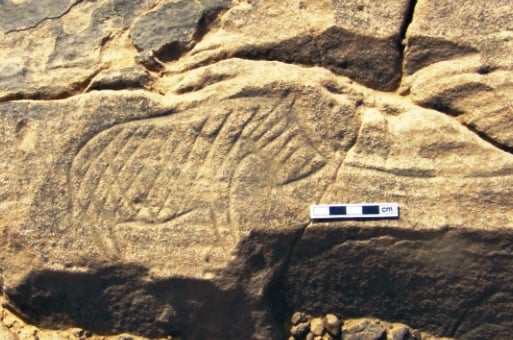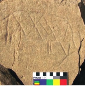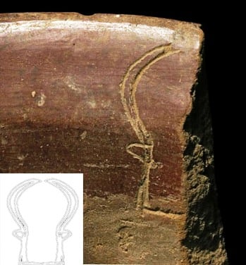 Un coccio inciso trovato tra i detriti del tempio. Da un lato c’è l’emblema distintivo della dea vacca la cui immagine apparirà anche sulla tavolozza di Narmer, mentre il rovescio mostra una figura femminile stilizzata tenuta prigioniera da un antico simbolo dell’autorità reale, il toro. Foto dal sito internet “hierakonpolis-on line.org