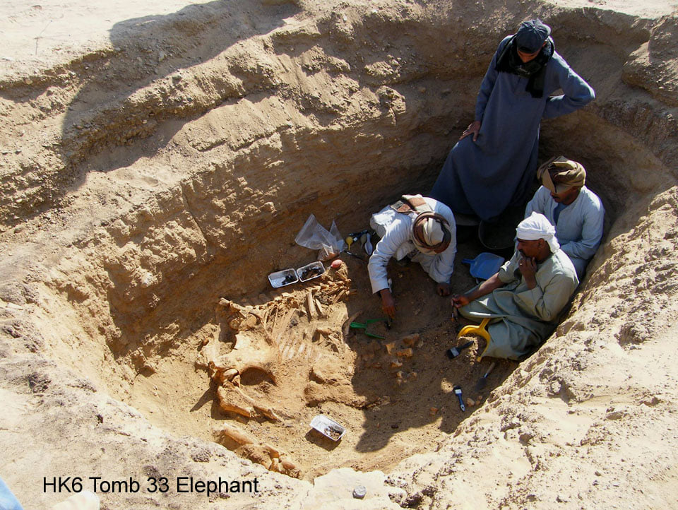 Se accompagnare il sovrano nell’aldilà era ritenuto un privilegio per l’uomo, lo era certamente anche per la maggior parte degli animali nei confronti dei quali sono evidenti diversi livelli di cura e di apprezzamento. Datazioni al radiocarbonio eseguite su due esemplari indicano che entrambi hanno incontrato la loro fine nello stesso momento in una data compresa all’incirca tra 3660 e il 3640 a.C. Sepolti interi, il campionario include un elefante africano, un uro (bovino selvatico), un alcelafo (una varietà di antilope) gravido, un giovane ippopotamo, un coccodrillo, due babbuini, 15 bovini domestici, due grandi capre e 28 cani.