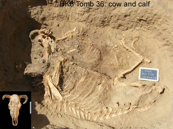 Il sacrificio di beni preziosi è attestato, inoltre, dalla sepoltura di un vecchio toro nella sua grande tomba (Tomba 43), così come nella vicina Tomba 36 contenente una mucca e un vitello (Tomba 36), ma ancor di più è evidente nella Tomba 49, una grande fossa simile a una trincea lunga 13,5 metri, che conteneva 12 bovini, sepolti interi e non macellati, tutti sotto i 3 anni di età: l’offerta dunque di un cibo di prima qualità. Non è del tutto chiaro a chi appartenessero questi 12 bovini. Dalla posizione della Tomba 49, potrebbero sia far parte del complesso della Tomba 16, sia appartenere ad un altro complesso a sud.