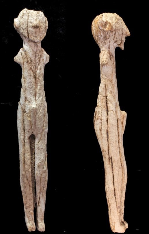 Probabile ritratto in selce del nano sepolto nella Tomba 47. Sebbene sia stato ritrovato nei livelli superficiali a nord-ovest, questo pezzo straordinario potrebbe rappresentare proprio quel nano con le gambe arcuate e le braccia poco sviluppate. Sia nello scheletro dell’immagine precedente, che nella statuina è ben evidente l’acondroplasia da cui era afflitto. Testa e tronco di proporzioni normali, braccia e gambe molto corti.