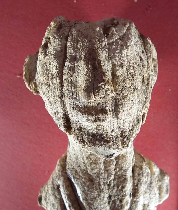 L’oggetto più importante era una statuetta alta 32 cm. di un uomo barbuto e in posizione eretta, scolpita in avorio ricavato da zanne di ippopotamo. Mancano le braccia che, in origine, dovevano essere ai lati del busto e con le mani poggiate sulla parte superiore delle gambe. Le termiti hanno distrutto la superficie lucida originaria dell’avorio, ma sono ancora riconoscibili i tratti del volto caratterizzato da naso aquilino, orecchie piuttosto grandi, sopracciglia arcuate, labbra sporgenti e una barba corta e appuntita.
