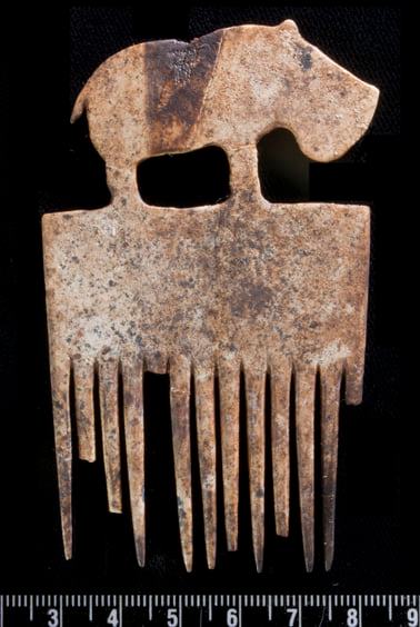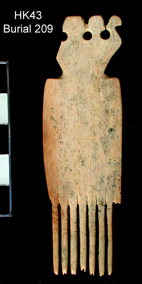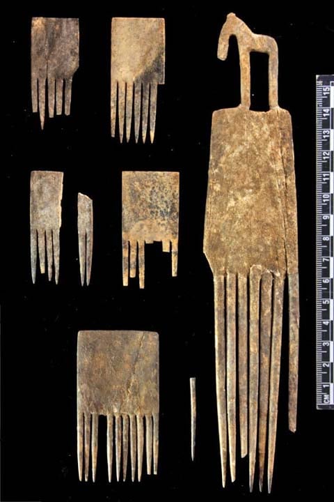 Sempre dalla stessa zona provengono sei pettini d’avorio. Uno di questi presentava la sommità scolpita con la figura di un animale dalle lunghe gambe e il naso prominente, ma con le orecchie spezzate. Probabilmente si tratta di un asino. Gli altri cinque pettini hanno la parte superiore piatta ed hanno forma quadrata o rettangolare. Sono tutti realizzati con avorio ricavato da zanne di ippopotamo. Altri tre pettini sono stati ritrovati presso il lato nord della sepoltura. Al centro ce n’era uno con la figurina di un ippopotamo scolpita superiormente. La schiena dell’animale sembra essere stata bruciata intenzionalmente come per procurarsi una magica protezione dal pericolo che la bestia selvatica poteva costituire.