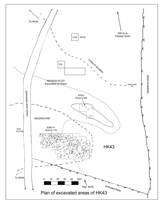 Come di consueto per il periodo predinastico, i corpi venivano adagiati su una stuoia in posizione rannicchiata sul fianco sinistro e rivolti verso occidente. Venivano poi ricoperti da un sudario di lino e spesso protetti da ulteriori stuoie, che in alcuni casi potevano raggiungere il numero di dieci. Soltanto il 9% delle sepolture di Hk 43 è stato ritrovato intatto e, sulla base dei frammenti di ceramica rinvenuti in alcune tombe, si suppone che il saccheggio abbia avuto luogo a partire dall’epoca greco-romana, sino a quella medievale (XI secolo d.C.), per cui non è facile valutare l’entità del corredo di chi vi fu sepolto. Si sa, inoltre, da documentazione d’archivio, che anche Green condusse scavi sul posto e sono state recuperate ossa da lui contrassegnate.