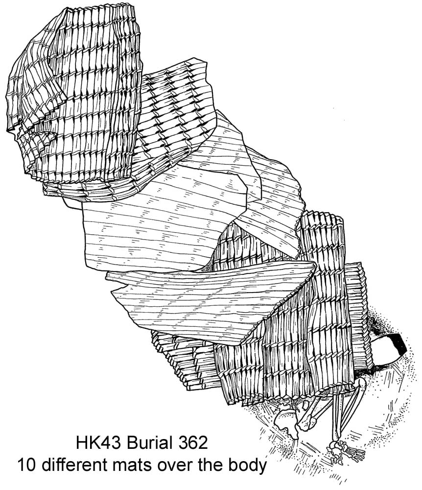 Scendendo verso il pavimento della tomba, ci sono stati altri ritrovamenti: cuscinetti di lino imbevuti di resina, spessi fino a 1,5 cm, usati per avvolgere e imbottire alcune parti del corpo, fornendo un’ulteriore prova che la proto-mummificazione conosciuta da HK43 era praticata anche dall’élite. Il pavimento era rivestito da tre strati di stuoia, al di sotto dei quali si trovavano bastoni e pezzi di legno più grandi, fino a 4 cm di lato, che con ogni probabilità costituivano una sorta di letto. È evidente che ci si è preoccupati molto di allestire la tomba per questi due giovani.>>