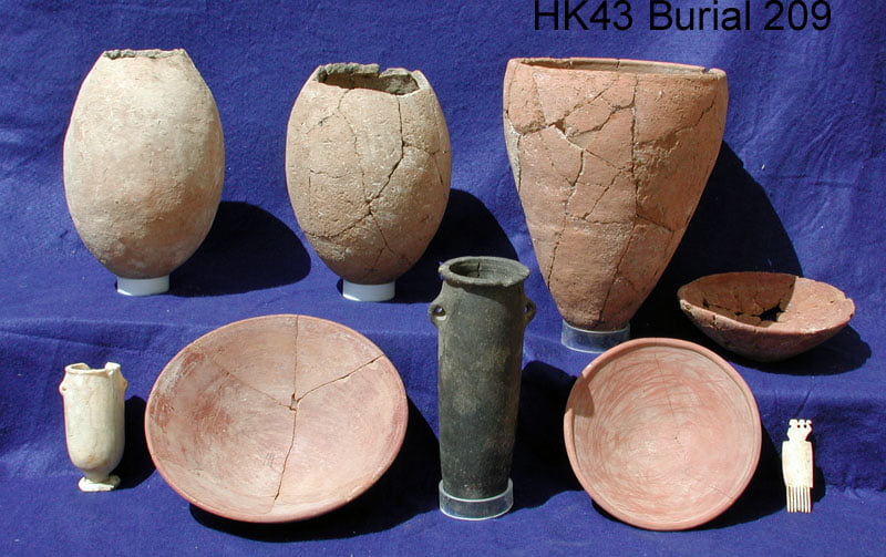 Per lo più gli oggetti offerti nelle sepolture erano stati ampiamente usati in vita. Nella Tomba 209, occupata da una donna dell’età di circa 45 anni, il corredo era rappresentato da tre ciotole di ceramica rossa, una, molto profonda, di materiale marnoso e due recipienti di ceramica grezza il cui collo doveva essersi rotto durante l’utilizzo dal momento che i bordi furono molati prima di essere deposti. Erano presenti, inoltre, due vasi di pietra (uno di basalto e un altro di calcite gravemente scheggiato) ed un pettine di avorio che mancava già di un dente.