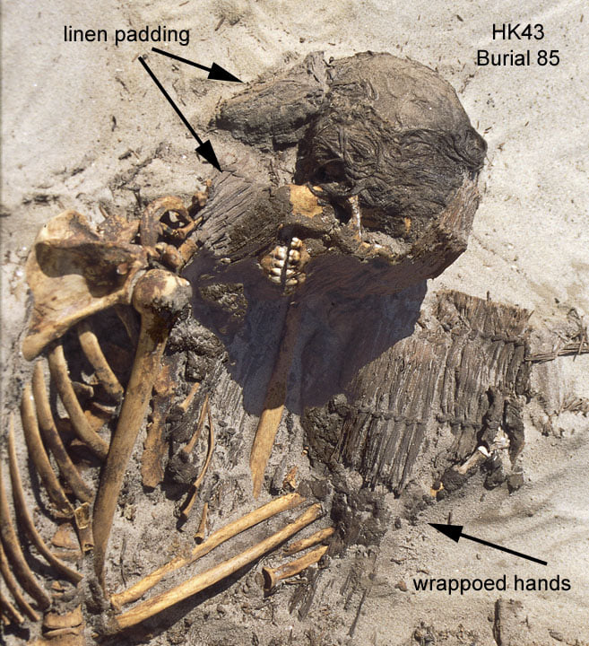 Questa sorta di tamponi è stata recuperata anche dalle tombe del cimitero di élite Hk6 suggerendo che un simile trattamento non era appannaggio esclusivo ed era riservato indifferentemente a soggetti di sesso e ceto diversi . Le evidenze indicano che avessero più lo scopo di salvaguardare l’articolazione che non l’aspetto fisico del defunto. Ciò non significa affatto che non fossero interessati ad apparire nel miglior modo possibile nell’altro mondo.