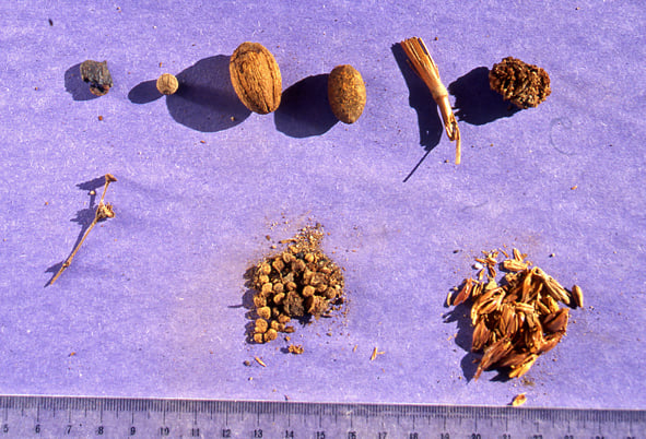 A sinistra: alimenti rinvenuti nella necropoli Hk43. In alto due forme di pane, al centro, al centro resti di melone. In basso a destra, frutti, commestibili, “nebk”, prodotti dalla Ziziphus spina-christi. In basso a sinistra, rinvenuto nella tomba di una donna anziana, un sacchetto contenente un bulbo d’aglio che conservava ancora il suo odore dopo circa 5500 anni! A destra: i frutti della Ziziphus spina-christi. Si tratta di un albero originario dell’Africa Settentrionale e tropicale. Sia i frutti che le foglie venivano utilizzati nell’Antico Egitto per la preparazione di cibi e nelle pratiche cultuali.
