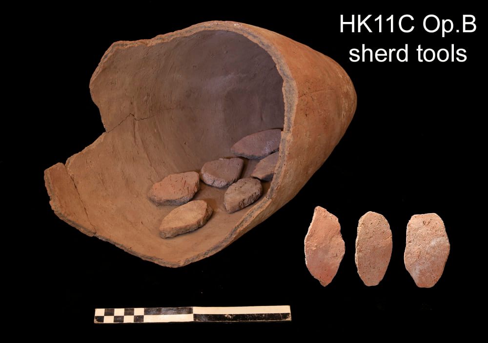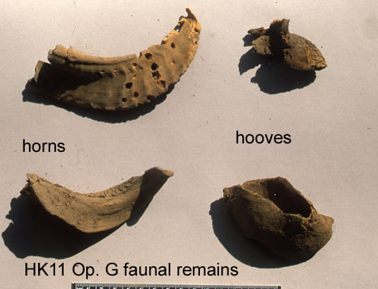 Gli scavi del 2012 nel complesso HK6 hanno prodotto abbondanza di ossa e tessuti e una quantità non trascurabile di rifiuti; solo pochi oggetti si sono distinti per la loro rarità. Si possono segnalare una parte di testa di mazza piriforme in calcare proveniente dalla tomba N. 53, la metà di una lancia in selce proveniente dalla N. 52 e una minuscola testa umana in argilla non cotta trovata nella N. 56, anche se questa potrebbe non essere la sua sede originaria. L’area intorno al Muro B7 è stata un po’ più generosa e ha restituito una zampa e il corno decorato di una statuetta di mucca in argilla cotta, oltre ad alcuni piccoli frammenti di una maschera in ceramica.
