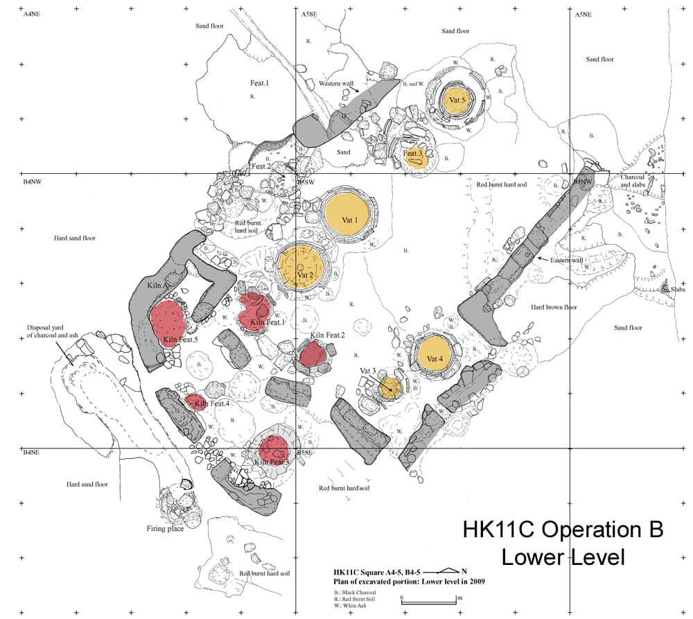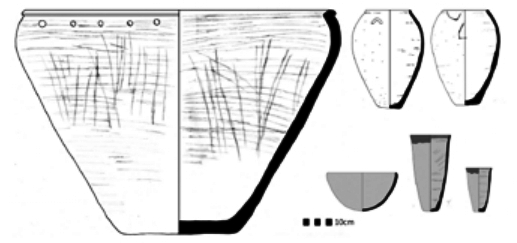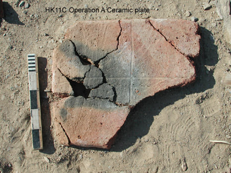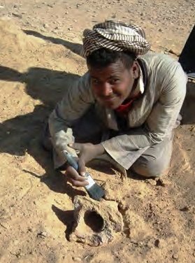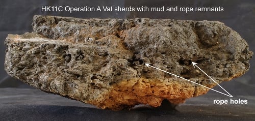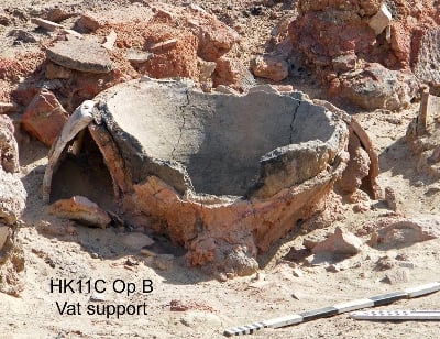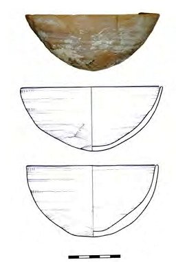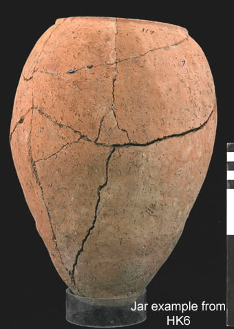Tuttavia, i reperti ceramici più impressionanti si sono rivelati i frammenti di un grande vaso, di forma simile ai tini utilizzati nelle birrerie, ma in questo caso accuratamente rifinito con una patina rossa (ora divenuta rossastra) e una brunitura su entrambi i lati. È stato possibile ricostruire più della metà del vaso grazie agli sforzi della restauratrice Lamia El-Hadidy, abilmente assistita da Feisel Sid-ain (Immagini nn.1 e 2).