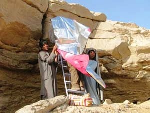 A sinistra: immagine n. 4: Helena Jaeschke, con il collega Xavier, alle prese con i frammenti dell’enorme vaso rosa(©Ph. Hierakonpolis Expedition, Nekhen News vol.25, autunno 2013). A destra: immagine n. 5: Lamia El-Hadid, rimette insieme frammenti del grande vaso (©Ph. J.Rossiter, Nekhen News vol.25, autunno 2013)