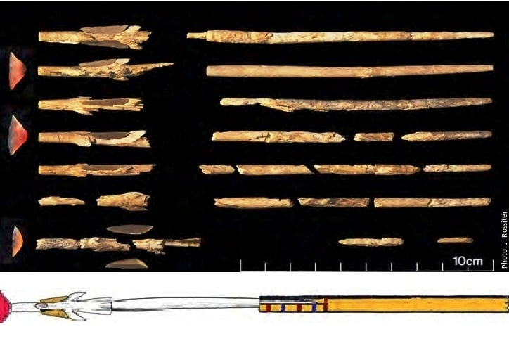 Altro elemento caratteristico del corredo di questa sepoltura sono le punte di freccia, di un tipo fuori dall’ordinario. Dal momento che i frammenti erano sparsi in modo caotico (un plauso alla squadra di cercatori per aver recuperato tutti i pezzi e a Xavier Droux per averli rimessi insieme), non siamo del tutto sicuri di quante fossero le diverse varietà, ma un tipo è certamente unico. Si tratta di punte di freccia a punta smussata in avorio intagliato con due serie di barbe poste su lati alternati. La maggior parte di esse sono caratterizzate da piccole lame di selce inserite in fessure appena sopra una serie di barbe. In due casi, le selci erano ancora al loro posto, ma è stato possibile associare le altre alle rispettive punte di freccia dal momento che le fessure erano fatte su misura e si adattavano, pertanto, solo ad un determinato elemento.L’uso di microliti o minuscoli pezzi di selce nella costruzione di frecce combinate è una tecnica antica che risale al Paleolitico, ma divenne di nuovo popolare soprattutto nel Nuovo Regno. Anche le frecce intagliate con barbe sono ben note, ma entrambe insieme non hanno eguali in nessun periodo di tempo. Ancora più curioso è il modo in cui la base di ogni punta di freccia è stata forata per creare una presa lunga circa 1 cm, ma larga solo circa 4 mm, per l’inserimento di un altro elemento. L’incavo è così piccolo che è difficile immaginare cosa potesse entrarci se non il codolo scolpito alla fine delle lunghe aste d’avorio che abbiamo trovato nella tomba. È esattamente della misura giusta. Naturalmente è ugualmente possibile che le aste affusolate siano punte di freccia a sé stanti, delle quali sono noti molti esemplari. Lo stesso si può dire per i lunati (punte di frecce a forma di mezzaluna) di corniola rinvenuti nella tomba, che potrebbero essere stati attaccati con mastice a semplici fusti. Tuttavia, rimane la possibilità che tutti questi pezzi fossero prodotti per essere montati insieme. Si tratterebbe di un assemblaggio piuttosto elaborato e sorprendente anche se poco pratico. L’ipotesi è ancora piuttosto dibattuta dato che frecce con la punta smussata, sono usate frequentemente ancora oggi per la caccia alla piccola selvaggina, laddove non si desideri una penetrazione troppo profonda. Inoltre, le estremità smussate impediscono ai dardi di incastrarsi negli alberi o nel terreno, rendendone più facile il recupero; obbiettivo che deve essere stato in cima ai pensieri di questi lontani antenati considerando la cura e l’abilità impiegate nella realizzazione di questi codoli in avorio. In conclusione, il numero preciso (nove se tutti gli elementi furono pensati per essere assemblati insieme) e i tipi di frecce restano ancora da determinare, ma possiamo essere abbastanza sicuri che il proprietario della Tomba 111 amasse cacciare, o almeno dare quell’impressione (Immagini n. 4-5).