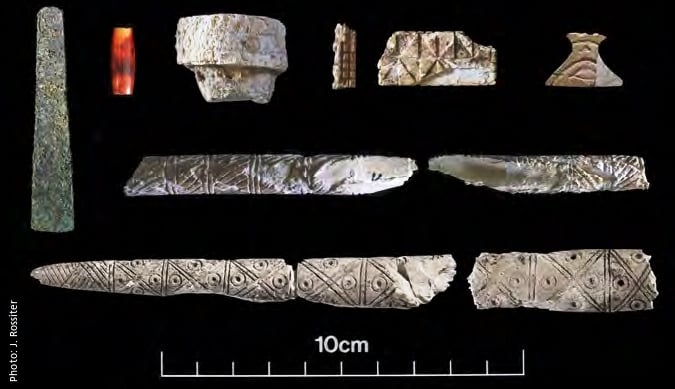 Altri frammenti attestano una varietà di oggetti d’avorio intagliato nella tomba, ma non c’è dubbio che il bene più prezioso fosse l’incredibile manico di coltello decorato trovato durante l’ispezione finale del pavimento. L’importanza di questo spettacolare ritrovamento non può passare inosservata. Solo altri 12 manici di coltello più o meno completi di questo tipo sono conosciuti nel mondo e questo è uno dei pochi ad avere un contesto databile.