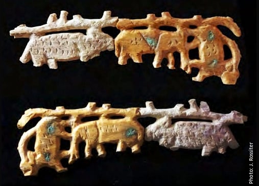 Dai frammenti superstiti, che includono un’altra antilope e forse un cane selvatico, possiamo dire che questo oggetto era composto da almeno tre file di animali, e i pezzi del bordo indicano che originariamente era rettilineo. Avori modellati nelle forme di questi animali sono ben noti nel periodo Naqada III, specialmente dal deposito principale di Hierakonpolis, ma l’artigianato traforato di questo reperto non ha eguali.