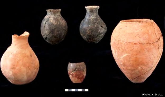 Perfino i cocci di ceramica erano relativamente scarsi. Ciononostante, è stato possibile ricostruire diversi vasi dai frammenti sparsi diffusamente, anche se non appariva del tutto chiaro da quali tombe provenissero. Le tipiche giare, con orlo modellato e temperate con paglia, tutte con segni di pre-cottura e in un caso anche di post-cottura, due bicchieri con tappo nero e una ciotola emisferica lucidata di rosso hanno consentito di datare il complesso al periodo Naqada IIA-IIB.