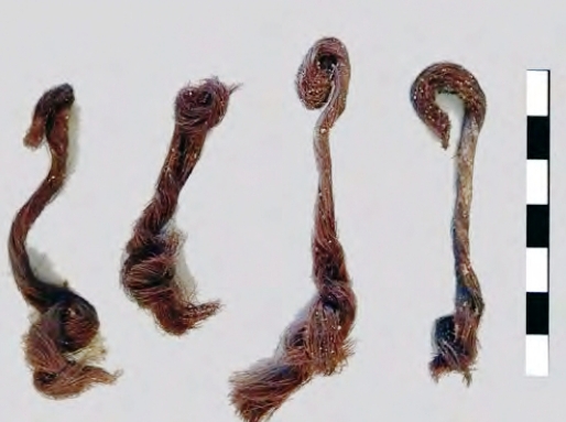 Avvicinandoci al pavimento, la tomba ha restituito un’altra cosa piuttosto rara ad HK6: capelli, e tanti. Questi potevano essere divisi in due gruppi in base a caratteristiche distintive. Un tipo si presentava sotto forma di grandi ciocche di capelli spessi, leggermente increspati e con alcuni riccioli, che sembravano essere stati portati relativamente corti. Un particolare piuttosto inquietante è che sembra siano diventati la dimora di un gran numero di parassiti, probabilmente attratti da alcuni grassi o oli applicati sui capelli, forse mentre la tomba era in preparazione. L’altra capigliatura era più interessante. Era, infatti composta principalmente da singole “extensions”, realizzate con due ciuffi di capelli attorcigliati insieme e che terminavano con una piccola ciocca. Siamo riusciti a raccogliere 15 “extensions” diverse, ciascuna originariamente lunga circa 14 cm. Le porzioni superstiti dei capelli naturali ondulati della proprietaria hanno rivelato che le aggiunte furono impiantate grazie a legature. Leggermente diverse dal colore dei capelli della defunta, le “extensions” furono chiaramente realizzate con i capelli di qualcun altro, il che le rende il primo esempio di capelli “finti” in Egitto, e forse nel mondo! Ma non sono le prime ad essere state scoperte. Dal cimitero non elitario HK43 di Ieracompoli abbiamo un altro esempio in cui le ciocche furono annodate ai capelli naturali sulla corona della testa per conferire un effetto di sollevamento. In questo caso, però, i capelli utilizzati erano quelli del proprietario della tomba, appena reimpiegati. I capelli effettivamente “finti” della tomba 78 sembrano essere di poco precedenti. E’ evidente che le maggiori disponibilità potevano permettere l’acquisto di capelli di altri individui, pur di abbellire il proprio aspetto (occupazione, è evidente, che in Egitto sembra aver costituito grande aspirazione sin dai tempi più remoti) e probabilmente incoraggiare una vera e propria moda. (Immagine n. 6).