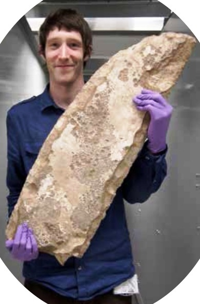 Immagine n. 2: Ross Irving e l’impressionante coltello gigante di Ieracompoli, ora a Edimburgo. (©Ph. Hierakonpolis Expedition, Nekhen News vol.24, autunno 2012)