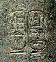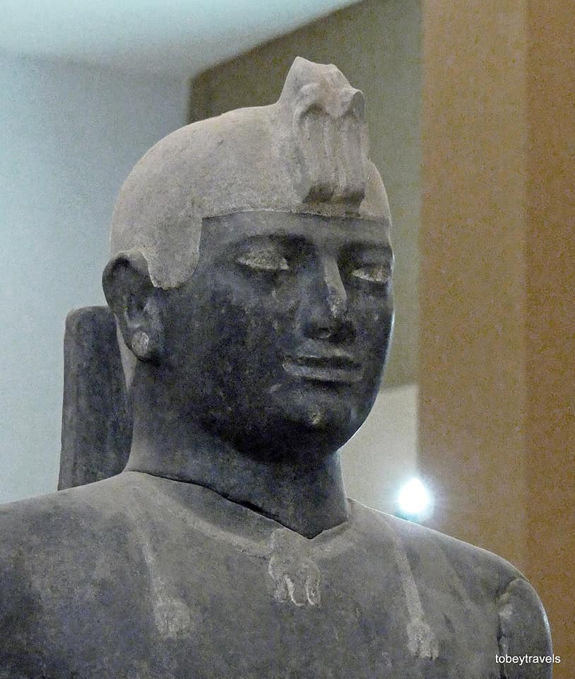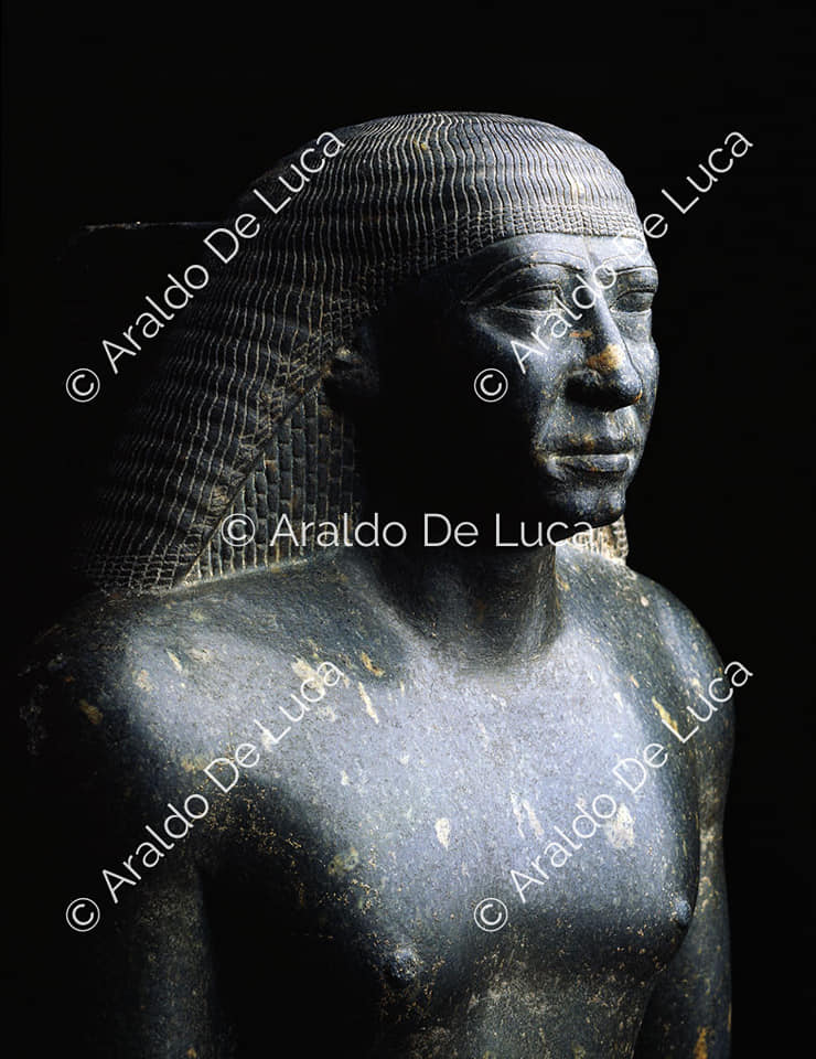 Si apprezza anche come sul petto sia presente il cartiglio con il nome del faraone scritto in scrittura geroglifica. l’intera scultura poggia su un piedistallo rettangolare realizzato con lo stesso granito utilizzato per realizzare la scultura