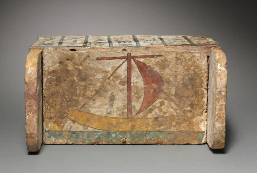 L’elevata domanda di shawabty nel periodo tardo, un’epoca in cui nella tomba con il defunto venivano collocati fino a 400 o più shawabty, diede origine a un contenitore specializzato per conservarli: la shawabty box. Questo esempio è inscritto per la padrona di casa, Ditamenpaankh, ed era probabilmente uno di una coppia originariamente realizzata per lei. La barca unialbero sul coperchio della scatola è forse un’allusione al pellegrinaggio del defunto alla città santa di Abydos, la città di culto di Osiride, re dei morti. Gli shawabty all’interno sono esempi grezzi prodotti in serie fusi in uno stampo aperto. Realizzati in terracotta, la loro vernice blu imita shawabtys più costosi fatti di maiolica. Per quanto riguarda l’incantesimo shawabty, è stato rimosso dalla sua posizione tradizionale sul davanti dello shawabty e riposizionato sui lati della scatola, dove doveva essere scritto solo una volta