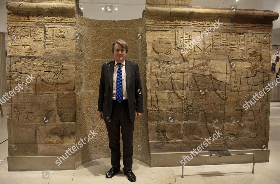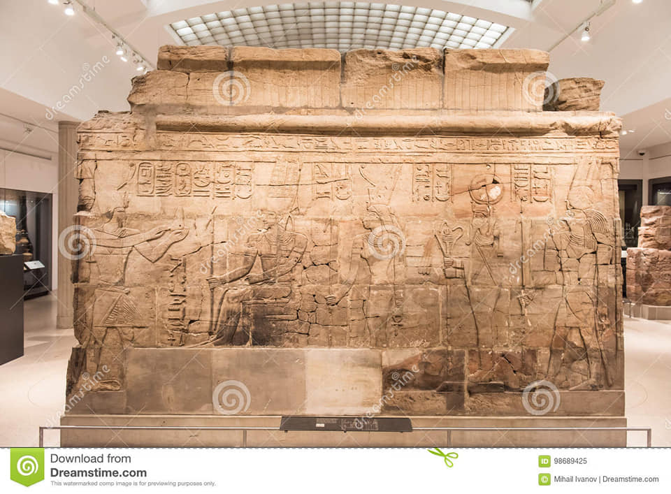 Pietra di Shabaka in mostra al British Museum . La pietra misura 0,66 per 1,37 metri, per più di 400 kg. Di peso.