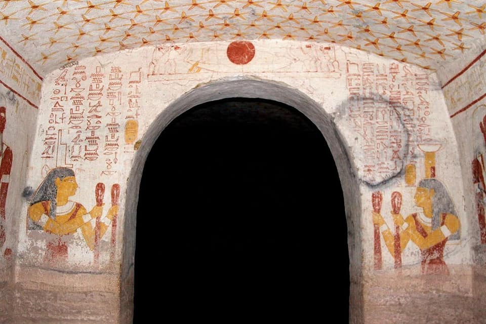 Le pareti sono state imbiancate e la decorazione realizzata con un’applicazione piatta di pittura, le linee guida dell’artista rosso sono ancora molto visibili. Nessuna parte delle pareti è scolpita. A causa di allagamenti e frane, l’arredo è andato perso ad un’altezza variabile, tra 0,60 me 1,60 m. La tomba non era stata completata, alcuni disegni e geroglifici erano stati completati solo come bozzetti. Alcuni colori non hanno resistito al tempo, motivo per cui numerose parti in nero o in blu sono oggi scomparse. È particolarmente vero per alcune parrucche, che originariamente erano di colore lapislazzuli, come i capelli degli dei, e che oggi sono bianche. Il nero degli occhi è particolarmente mal conservato. La composizione generale è semplice, con scene di benvenuto nell’anticamera e con scene più strettamente funerarie nella camera funeraria. La carnagione delle sagome obbedisce al rigoroso canone egiziano classico (che gli egiziani dell’epoca avevano tuttavia in gran parte abbandonato), con la pelle degli uomini rosso scuro e quella delle donne gialla, quasi paglierina. Il contorno dei personaggi è realizzato in giallo, e non in nero, come ci si aspetterebbe. Quelli dei geroglifici sono in rosso. La qualità delle rappresentazioni è media, che appare rigida e misurata, lontana dalle rappresentazioni tebane del secolo scorso. La grande dimensione dei personaggi è simile a quanto realizzato per i figli di Ramesse III nella Valle dei Re. Ma lì, la scarsità dei temi è stata comunque compensata da una bella qualità tecnica, che qui manca.