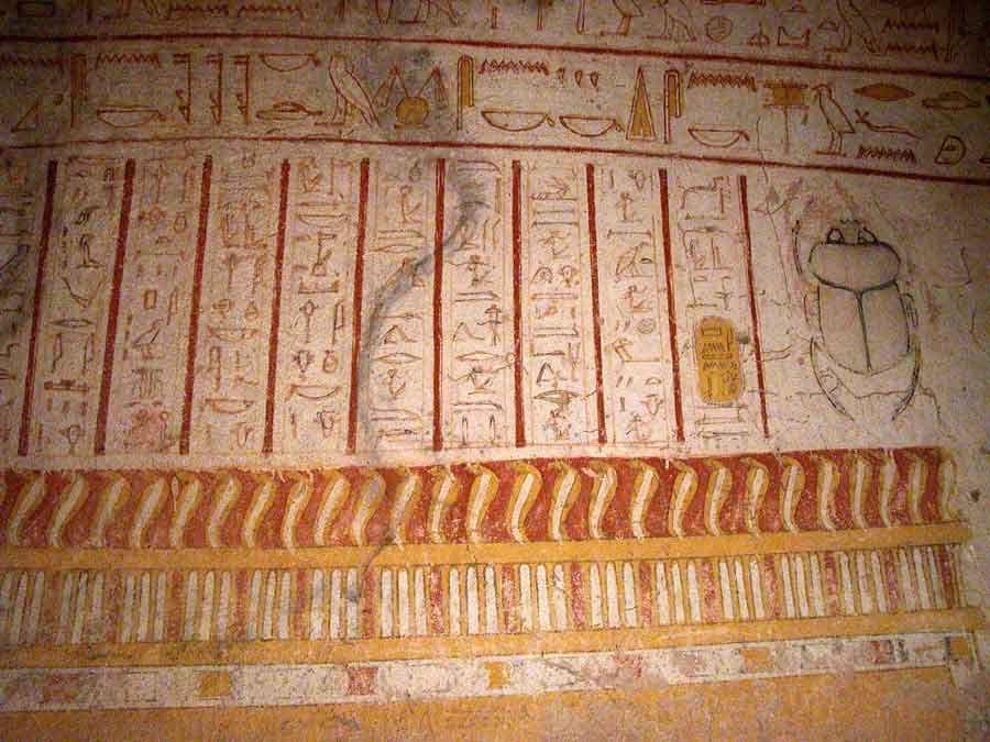 ,il principe ereditario Petisis(9)il conte Patjenefi,(10 il conte Pmui,(11)il gran capo dei Ma” Akanosh(12),il gran capo dei Ma” Djedsmenef ankh,(13) in basso segue l’inizio del testo.