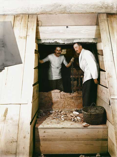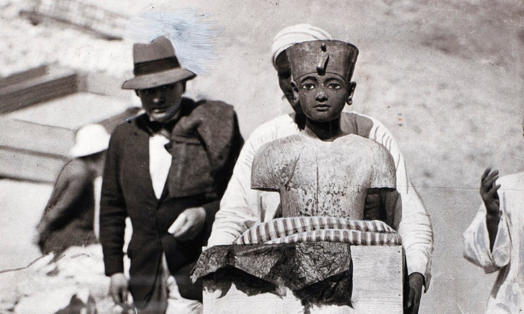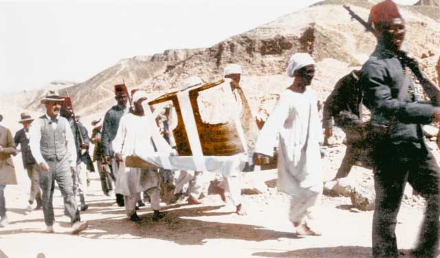 Il 27 Dicembre, dopo il lavoro preliminare, esce il primo oggetto dalla tomba. È una splendida cassa in legno trovata appoggiata per terra davanti al muro che conduce alla camera sepolcrale. Di lì in avanti, la squadra di Carter lavora come una macchina da guerra. Burton fotografa in situ, evidenziando la posizione di ogni oggetto, Carter descrive, Lucas provvede a “stabilizzare” i reperti, spesso con paraffina, Alan Gardiner traduce se necessario, Callender organizza il trasporto in sicurezza, di nuovo Burton fotografa i singoli oggetti e Mace con Lucas completa il primo restauro.