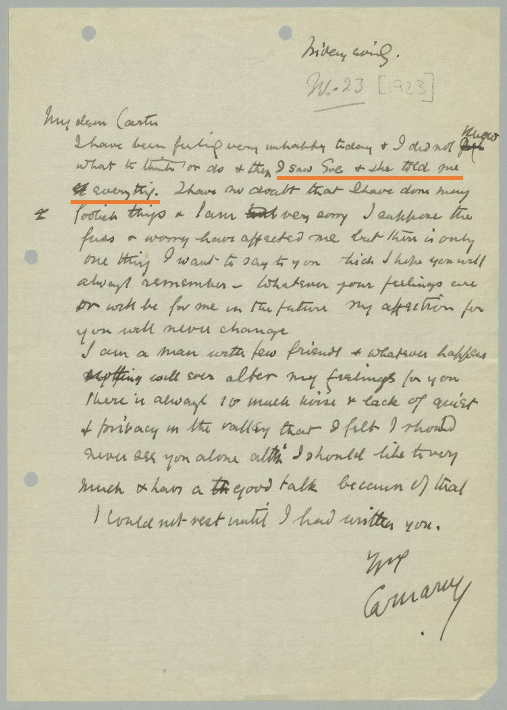 Il motivo della lite ci è ignoto, ma come al solito ci viene in aiuto Carnarvon stesso, che due giorni dopo scrive a Carter e, scusandosi per il suo comportamento, fa riferimento a “quando Evelyn mi ha detto tutto”. Per molti è la conferma che Carter ed Evelyn avessero dei…progetti extra-archeologici. È possibile che Evelyn abbia raccontato al padre della sua infatuazione? E cosa avrà detto durante l’alterco a Carter?