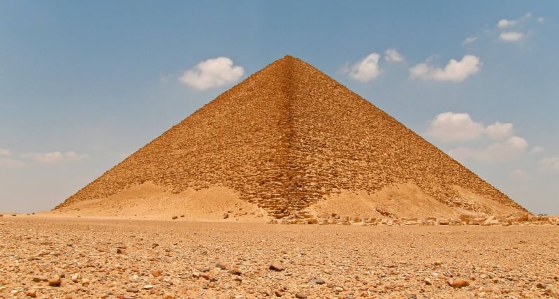 A sinistra: la cosiddetta “Piramide romboidale” di Snefru un’ulteriore evoluzione verso la forma definitiva. Probabilmente a causa di cedimenti fu ridotta la pendenza dell’edificio che ci appare pertanto di aspetto irregolare. A destra: con la Piramide Rossa (o Piramide Nord) di Snefru si giunge alla forma definitiva che sarà resa ancor più elegante e maestosa con le successive costruzioni a Giza. Alta in origine ben 105 metri, oggi la sommità del monumento risulta abbassata di circa 13 metri a causa dei furti avvenuti nel Medio Evo, durante il quali fu asportato l’abbagliante rivestimento di calcare bianco. Il colore rossiccio delle pietre del nucleo ha dato l’attributo al monumento.