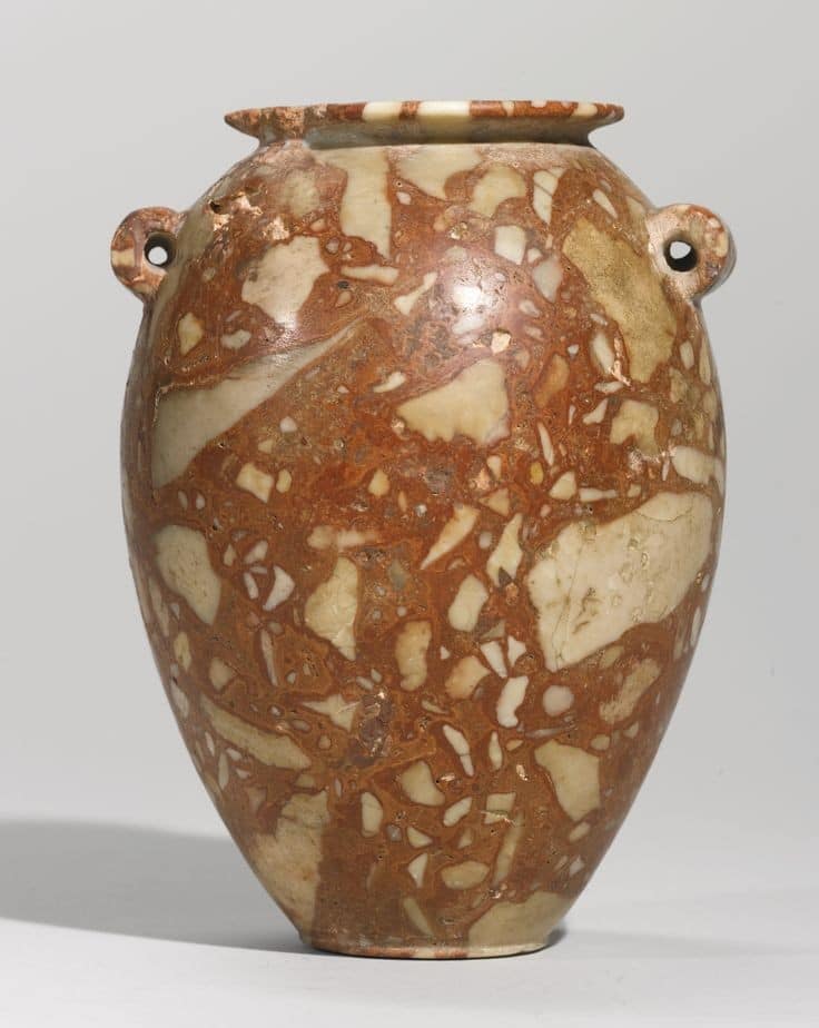 Gli egiziani svilupparono presto la capacità di lavorare la pietra dura in forma di vaso. Il basalto era popolare fin dall’inizio (4000 aC). Col passare del tempo, altre pietre sono entrate in uso, alcune trasportate da cave lontane nei deserti, rendendole preziose come status symbol. La maggior parte dei vasi era di forma convenzionale, ma occasionalmente venivano intagliati anche vasi a forma di animale. La colorata breccia rossa era una delle pietre preferite per i vasi realizzati a forma di animali come ippopotami, uccelli , tartarughe e rane. Ciascuno di questi animali aveva un significato specifico per gli antichi egizi.
