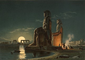 [2] Il nome fu assegnato ai due colossi (alti 18 m) dai greci che assimilarono il personaggio rappresentato (in realtà il re Amenhotep III) all’eroe Memnone, personificazione del giorno, figlio di Eos, l’aurora, che nella guerra contro Troia si schierò al fianco dei troiani venendo poi ucciso da Achille. Tale individuazione derivava dal fatto che, all’alba, verosimilmente per la dilatazione delle pietre ai primi calori del sole, uno dei due colossi emetteva un suono lamentoso che fu interpretato come il saluto del figlio alla madre Eos. Tale era l’ammirazione degli occupanti per le vestigia egizie, che l’imperatore romano Settimio Severo (193-211 d.C.) fece sottoporre la statua a un restauro dopo il quale, però, il fenomeno sonoro non si ripeté.
