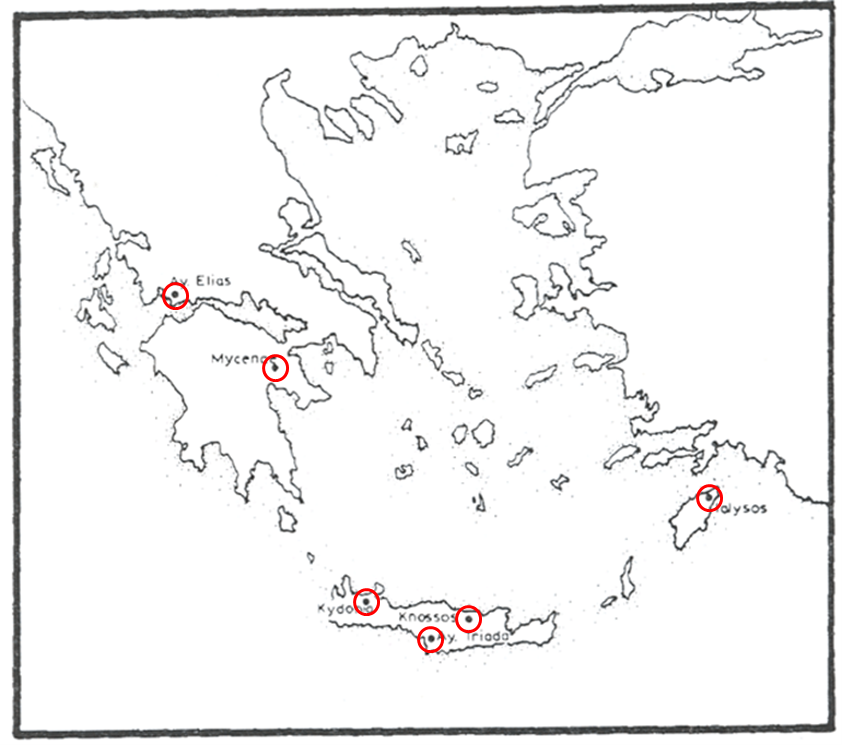 [19] Elenco riassuntivo dei dati riportati in E. Cline 1987, Table 1, p. 24: 6 a Micene; 1 ad Aetolia; 1 a Knosso; 1 Hagia Triada; 1 Kydonia; 1 Cipro.