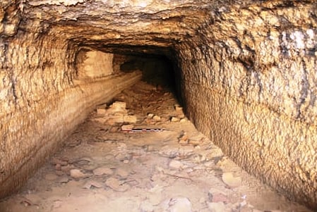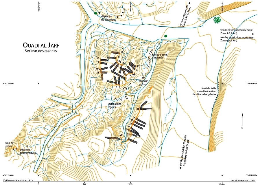 Il complesso di gallerie fu scavato a circa 7 km dalla battigia. Furono utilizzate come deposito per portare al riparo imbarcazioni, o loro parti smontate, e per conservare attrezzature, cibo, acqua e i materiali in attesa di essere spediti. Siccome il porto veniva utilizzato solo in alcuni periodi, gli ingressi delle gallerie venivano sigillati utilizzando blocchi di calcare pesanti fino a diverse tonnellate. Spesso erano così accuratamente posizionati che per liberare l’accesso bisognava agire di mazza e scalpello per aprirsi un varco di accesso attraverso l’ostruzione creata per proteggere il contenuto delle gallerie. Per di più, alfine di tutelarlo anche dall’umidità si provvedeva alla sigillatura con malta di argilla, dopodiché i blocchi venivano contrassegnati con inchiostro rosso. Per facilitare la riapertura delle gallerie fu escogitato un sistema che permetteva un notevole risparmio di tempo e fatica: tramite un congegno basato su binari di legno, del quale sono ancora visibili le tracce, diventava possibile far scorrere i blocchi, liberando l’ingresso (Immagine n. 1).