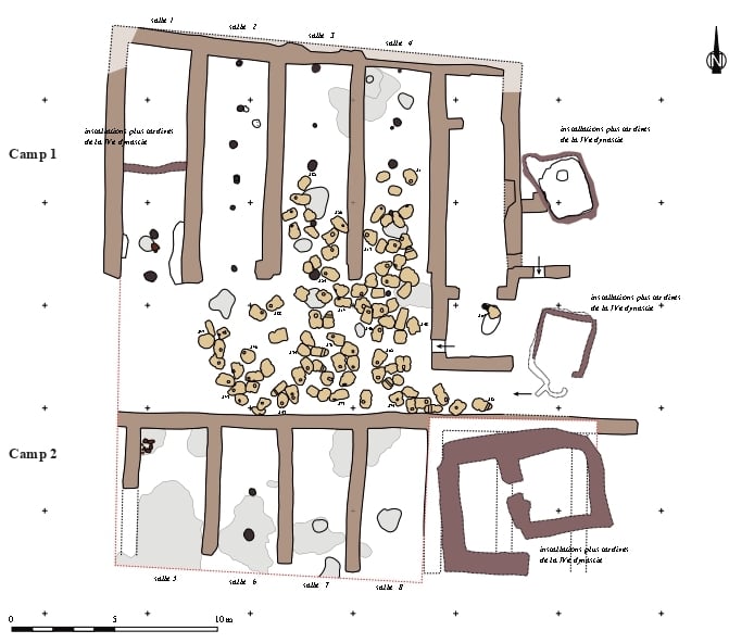 La più antica è riconducibile a due grandi strutture in pietra, lunghe 30 metri e larghe da 8 a 12 metri e presenta cellule disposte a pettine. Le due installazioni sono state costruite contemporaneamente, e l’una parallela all’altra, lungo l’asse nord-sud, con la parte posteriore rivolta a nord al fine di proteggere gli spazi interni dai venti prevalenti e dal rischio di insabbiamento. La loro pianta generale è tipica dei depositi, conosciuti attraverso le spedizioni, degli inizi dell’Antico Regno. (Immagine n. 1).