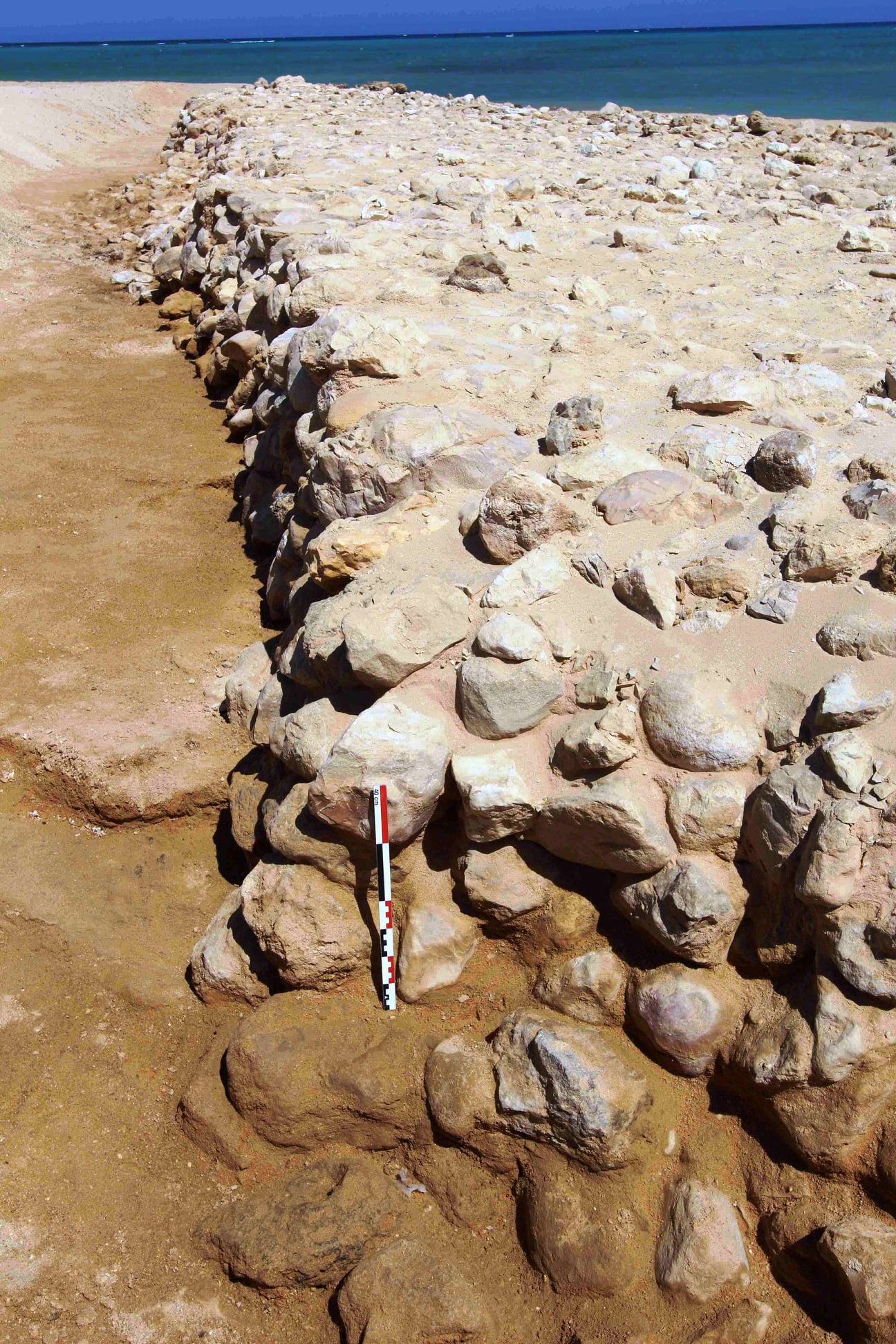 Le installazioni di fronte al molo (zona 6) sono state oggetto di studi supplementari all’inizio della campagna 2019 (dal 10 marzo al 30 marzo). L’area immediatamente a sud degli accampamenti è stata ripulita su una superficie di più di 200 mq , rivelando una zona di cottura dei cibi molto ampia e i resti di una ventina di focolari, talvolta delimitati da blocchi di pietra, i cui pavimenti sono costituiti da frammenti ceramici di grandi vasi di fabbricazione locale. Sono stati rimossi anche tutti i pavimenti in argilla delle stanze dell’edificio meridionale, al fine di verificare l’eventuale presenza di tracce di una precedente occupazione, come nella zona 5. Il test è risultato negativo e sembra confermare che il primo insediamento in questa parte del sito è effettivamente contemporaneo al regno di Cheope, del quale era stato rinvenuto un gran numero di sigilli nei pavimenti dell’edificio settentrionale. Ulteriori indagini sono state effettuate anche sulla costa, in linea con la parte meridionale del bacino artificiale delimitato dal molo. In questo punto, la presenza di una sporgenza sabbiosa, chiaramente di origine antropica, era stata notata fin dall’inizio dei lavori nel sito. Corrisponde palesemente ad una zona di depressione, immediatamente a sud del porto, costituita dallo sbocco verso il mare di un grande wadi che attraversa questa piana costiera. In questo punto, sono stati trovati due allineamenti paralleli di pietre, orientati da ovest a est. Sono ancorati alla riva e si estendono nel mare, dove sono ben visibili con la bassa marea. Probabilmente non corrispondono alla costruzione di un molo o di una rampa, come si era pensato inizialmente, ma alla delimitazione di un canale realizzata per proteggerlo dall’insabbiamento. In tal modo, la zona di depressione poteva essere utilizzata come zona di assemblaggio delle barche, in cui sarebbe stato sufficiente far penetrare il mare, con l’alta marea, per facilitare il loro galleggiamento. Questa ipotesi dovrà essere verificata in seguito, in particolare con una politica di scandaglio sistematico del cumulo di sabbia che è l’elemento più visibile di questo impianto.
