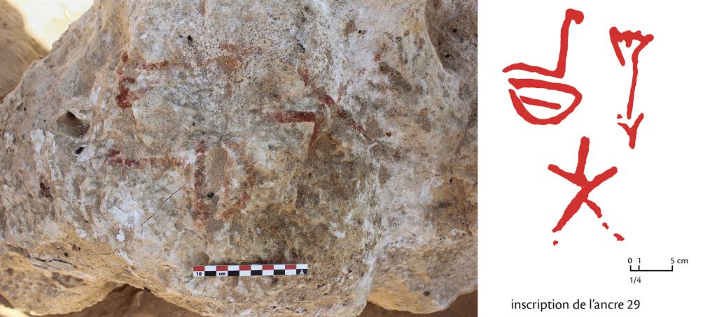 E’ stato ancora una volta sgomberato l’eccezionale deposito di 99 ancore identificato nel 2013. Questa operazione aveva lo scopo di migliorare la copertura fotografica realizzata durante la sua scoperta iniziale, ma è stata anche l’occasione per effettuare una registrazione più sistematica dei segni che erano incisi su queste ancore dalle squadre che le avevano immagazzinate lì, controllando sistematicamente i lati nascosti di questi oggetti. Il totale di queste iscrizioni potrebbe così essere portato, al termine della campagna, a un insieme di 70 documenti, 32 “segni rossi”, che fanno riferimento al nome delle barche a cui appartenevano le ancore, nonché alle squadre ad esse associate, e 38 “segni neri” – tracciati per la maggior parte per mezzo di un pezzo di carboncino – che identificano phyla (squadre) e sezioni di queste stesse squadre (Immagine n. 4) Questo corpus permette così di ottenere un’immagine dell’ultima flotta di Cheope che frequentava il luogo, prima della chiusura definitiva di questi edifici in riva al mare, e di ricostruire, a grandi linee, le strutture ad albero di queste squadre (Immagine n. 6).