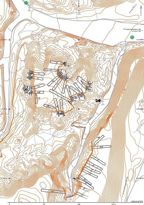 L’area delle gallerie deposito è stata oggetto di indagini molto intense. Al termine di tre campagne di scavo, tredici di queste, su un totale di circa trenta, sono state liberate. All’interno di tre gallerie era ancora visibile in superficie un grande deposito di grosse giare che erano probabilmente servite da contenitori per l’acqua da approvvigionare durante le spedizioni (Immagine 2).